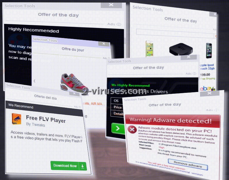 Selection Tools (セレクション・ツール)アドウェアは商業的なコンテンツを大量に提示するアプリケーションです。主にオンラインショッピングサービスの宣伝コンテンツの配信に重点が置かれていますが、使っているデバイスにウイルスが存在すると通知するセキュリティ警告に驚かされたと訴えるユーザーもいます。理論的には、ユーザーが役立つオファーに遭遇することもあり得ます。ただしSelection Toolsは信用できる広告提供ソフトウェアではありません。このプログラムは1日あたり3つのオファーを表示すると説明していますが、ユーザーはもっと多くのプロモーションに誘導されるのではないかと懸念しています。Selection Toolsによる広告はユーザーに関連したものが説明され、ウインドウ内に(サイズは通常のバナーくらいの大きさで)表示されます。