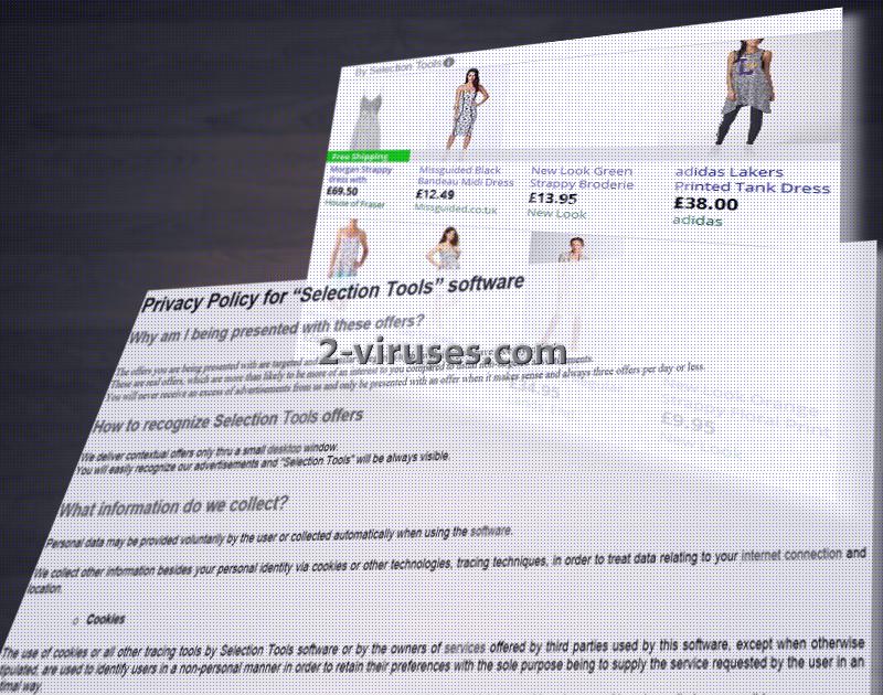 Selection Tools (セレクション・ツール)は、様々なベンダーや他のサードパーティーが提出するコンテンツの分布をすることで収益を受け取る広告支援アプリケーションに分類されています。私たちの印象としては、Selection Toolsによる広告としては多様なオファーが提示されていると見られました。その内容は、洋服、靴、ジュエリー、電子機器という項目から、さらにはテクニカルサポートサービスからのメッセージやその他のセキュリティ通知に至るまで幅広いものです。さらに、このアプリケーションは新しいソフトウェアのソースとしてポップアップやバナーを推奨、表示することもわかっています。馴染みのないソースからプログラムをダウンロードするとどうなるかは既に十分な情報が出ています。Selection Tools による広告に反応することは危険な行動であると強調しておく必要があります。このアプリケーションが、マルウェアや潜在的に望ましくないプログラムであなたのシステムを感染させようと企んでいるかユーザーの個人情報を盗み出そうとしている不正マテリアルを推奨しているとの苦情を私たちはよく耳にします。